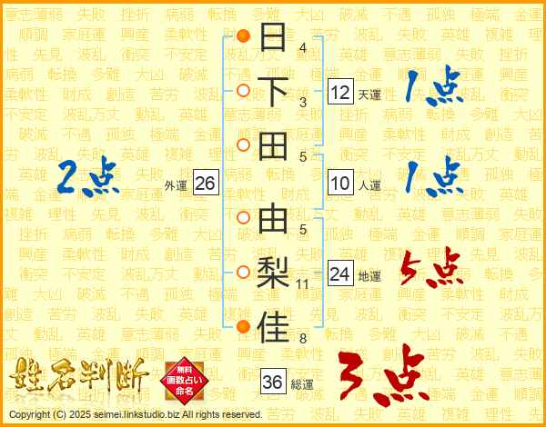 日(4画)下(3画)田(5画) 由(5画)梨(11画)佳(8画)