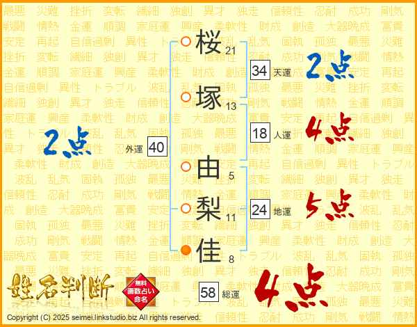 桜(21画)塚(13画) 由(5画)梨(11画)佳(8画)