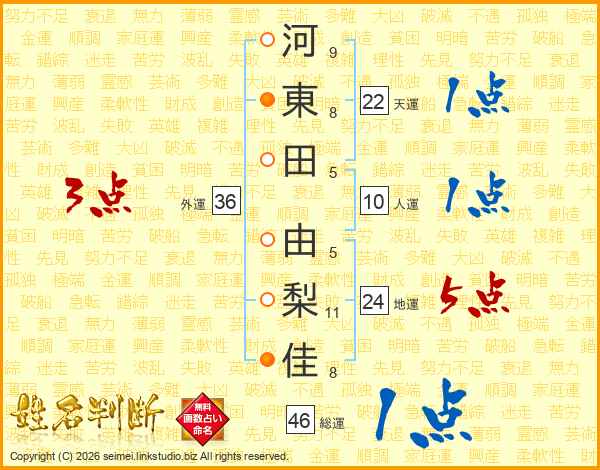 河(9画)東(8画)田(5画) 由(5画)梨(11画)佳(8画)
