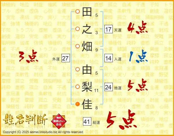 田(5画)之(3画)畑(9画) 由(5画)梨(11画)佳(8画)