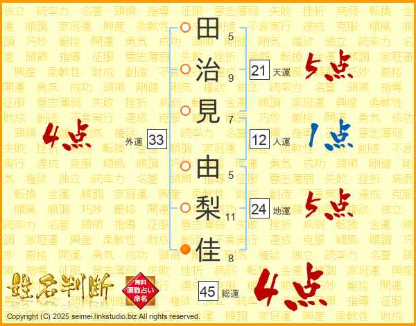 田(5画)治(9画)見(7画) 由(5画)梨(11画)佳(8画)