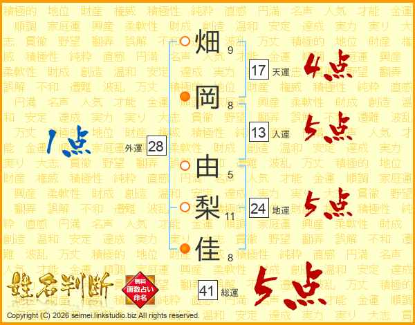畑(9画)岡(8画) 由(5画)梨(11画)佳(8画)