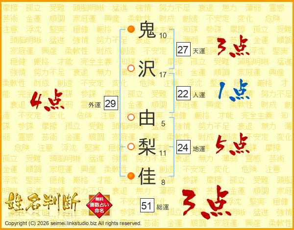 鬼(10画)沢(17画) 由(5画)梨(11画)佳(8画)