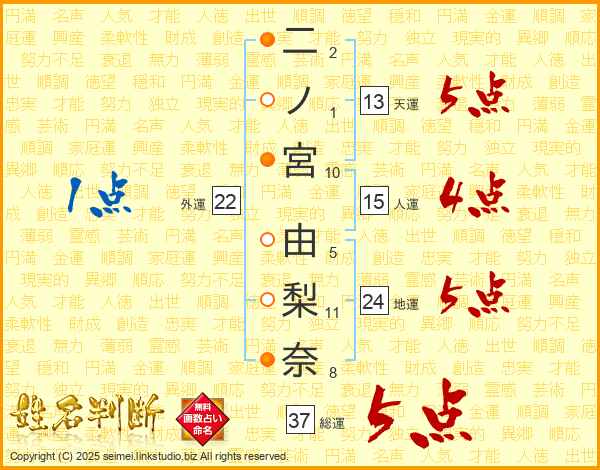 二(2画)ノ(1画)宮(10画) 由(5画)梨(11画)奈(8画)