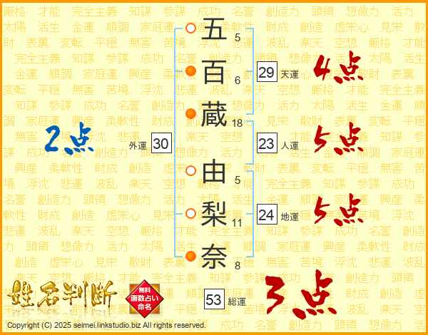 五(5画)百(6画)蔵(18画) 由(5画)梨(11画)奈(8画)