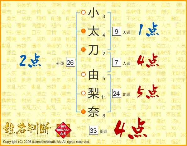小太刀由梨奈さんの総運は33画の4点!
