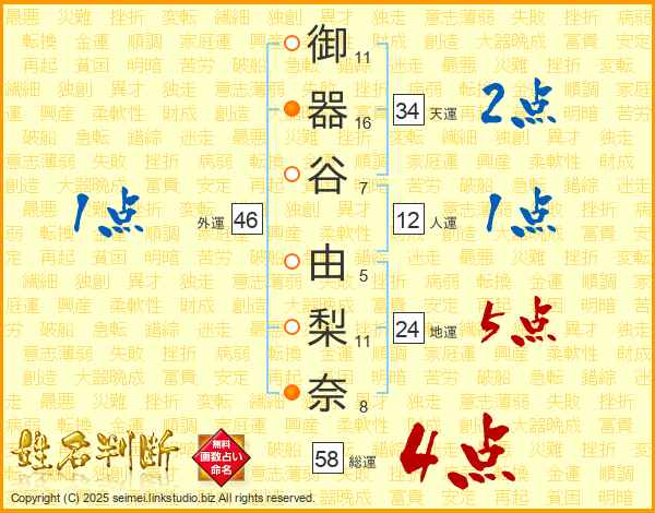御(11画)器(16画)谷(7画) 由(5画)梨(11画)奈(8画)