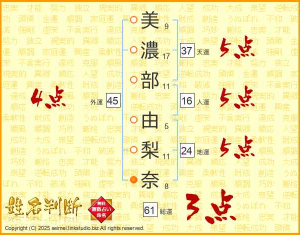 美(9画)濃(17画)部(11画) 由(5画)梨(11画)奈(8画)