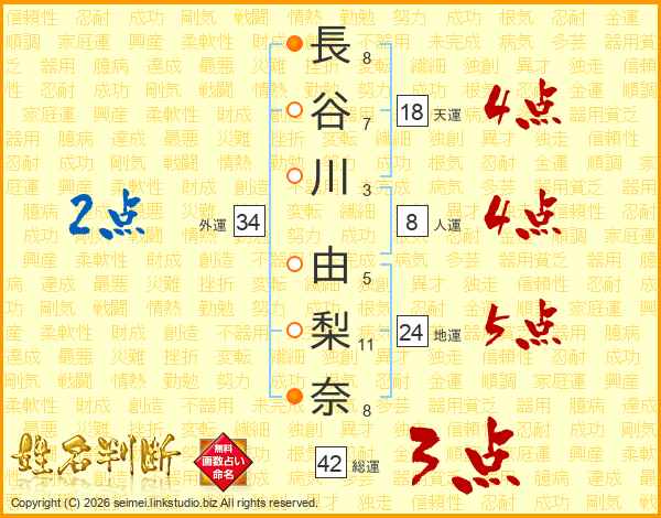 長(8画)谷(7画)川(3画) 由(5画)梨(11画)奈(8画)