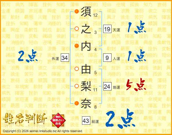須之内由梨奈さんの総運は43画の2点!