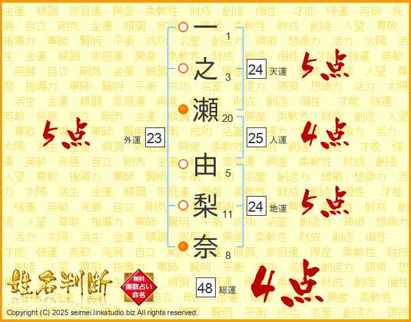 一(1画)之(3画)瀬(20画) 由(5画)梨(11画)奈(8画)