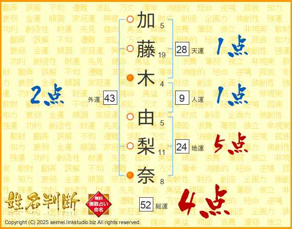 加藤木由梨奈さんの総運は52画の4点!