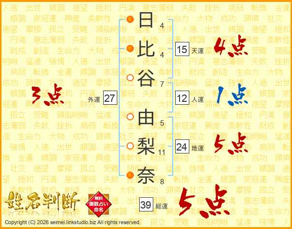 日(4画)比(4画)谷(7画) 由(5画)梨(11画)奈(8画)