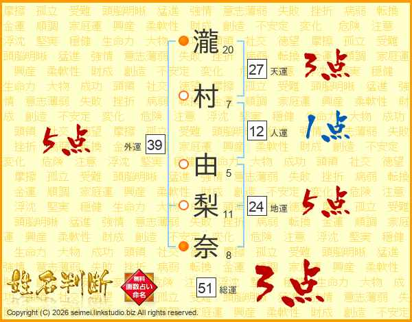 瀧(20画)村(7画) 由(5画)梨(11画)奈(8画)