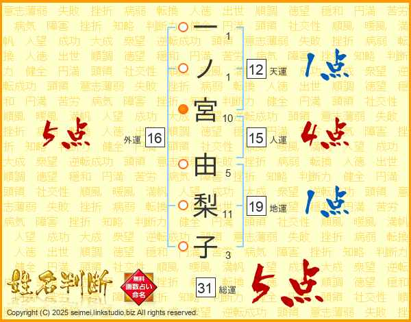 一(1画)ノ(1画)宮(10画) 由(5画)梨(11画)子(3画)