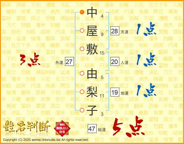 中(4画)屋(9画)敷(15画) 由(5画)梨(11画)子(3画)