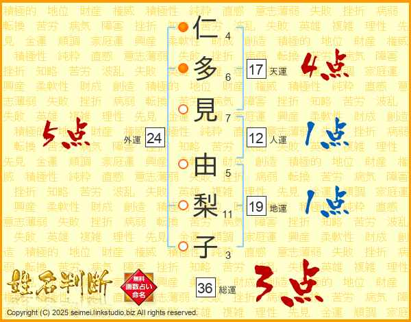 仁(4画)多(6画)見(7画) 由(5画)梨(11画)子(3画)