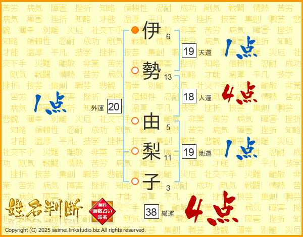 伊(6画)勢(13画) 由(5画)梨(11画)子(3画)