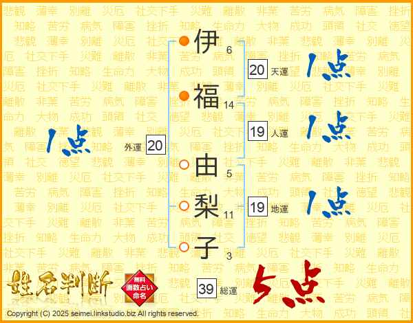 伊(6画)福(14画) 由(5画)梨(11画)子(3画)