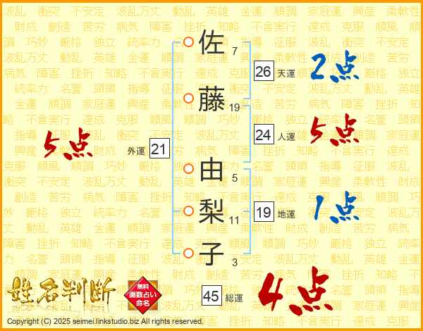佐藤由梨子さんの総運は45画の4点!