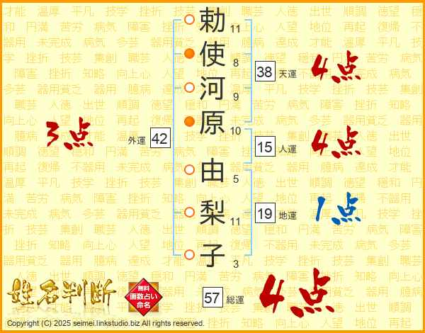 勅(11画)使(8画)河(9画)原(10画) 由(5画)梨(11画)子(3画)