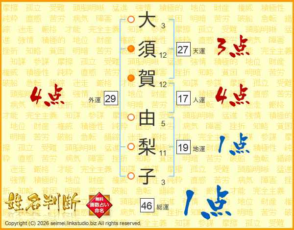 大(3画)須(12画)賀(12画) 由(5画)梨(11画)子(3画)