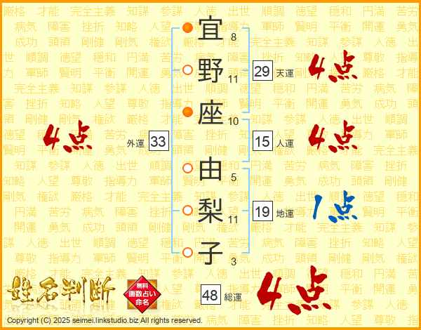 宜(8画)野(11画)座(10画) 由(5画)梨(11画)子(3画)