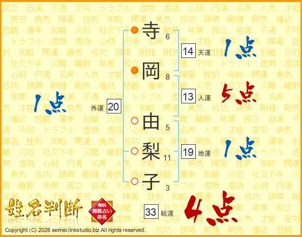 寺(6画)岡(8画) 由(5画)梨(11画)子(3画)
