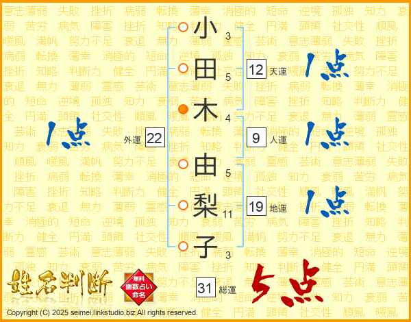 小(3画)田(5画)木(4画) 由(5画)梨(11画)子(3画)