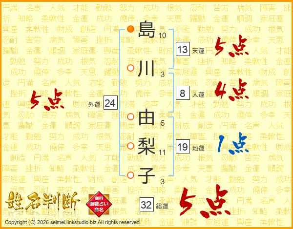 島(10画)川(3画) 由(5画)梨(11画)子(3画)