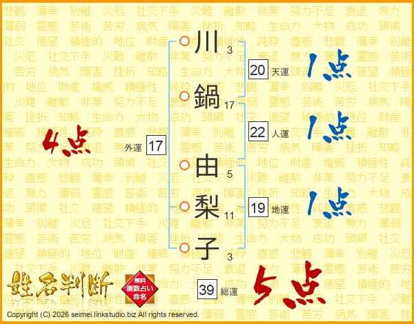 川鍋由梨子さんの総運は39画の5点!