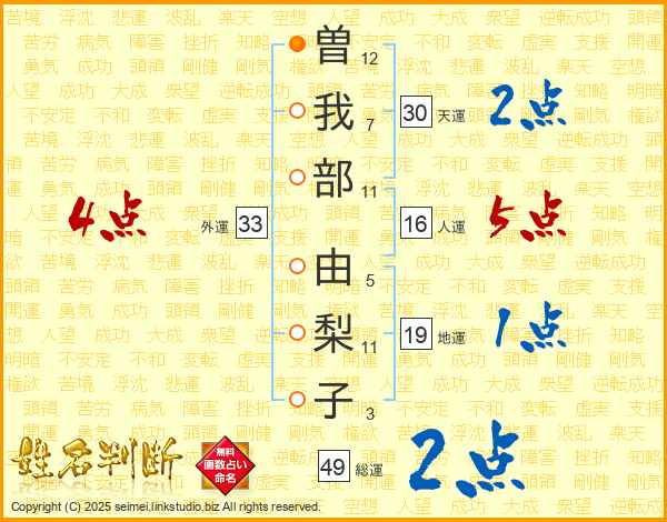 曽(12画)我(7画)部(11画) 由(5画)梨(11画)子(3画)