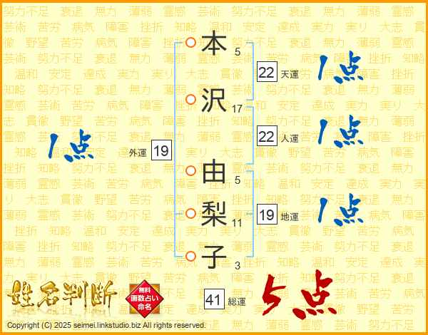 本(5画)沢(17画) 由(5画)梨(11画)子(3画)