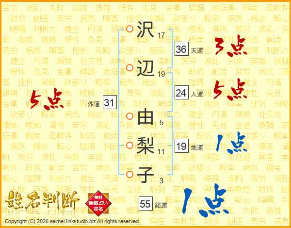 沢(17画)辺(19画) 由(5画)梨(11画)子(3画)