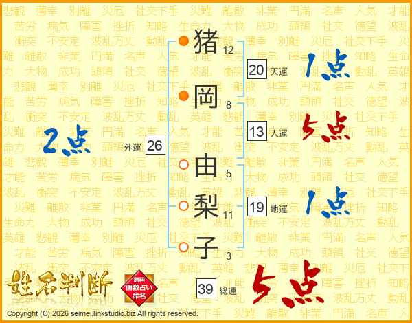 猪(12画)岡(8画) 由(5画)梨(11画)子(3画)