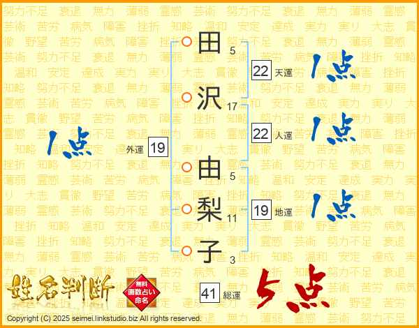 田(5画)沢(17画) 由(5画)梨(11画)子(3画)