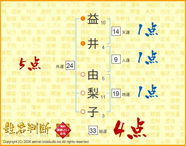 益(10画)井(4画) 由(5画)梨(11画)子(3画)
