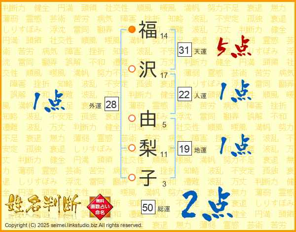 福(14画)沢(17画) 由(5画)梨(11画)子(3画)