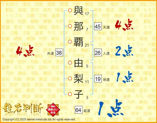 與(17画)那(7画)覇(21画) 由(5画)梨(11画)子(3画)
