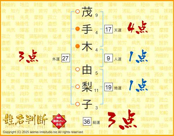 茂(9画)手(4画)木(4画) 由(5画)梨(11画)子(3画)