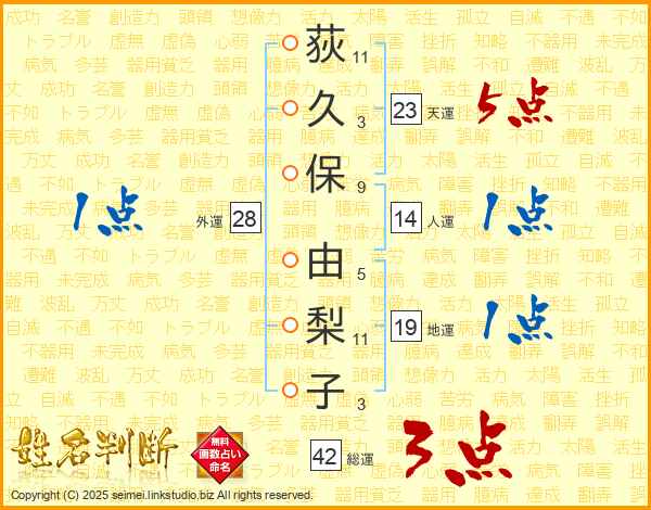 荻(11画)久(3画)保(9画) 由(5画)梨(11画)子(3画)