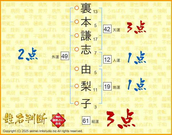 裏(13画)本(5画)謙(17画)志(7画) 由(5画)梨(11画)子(3画)