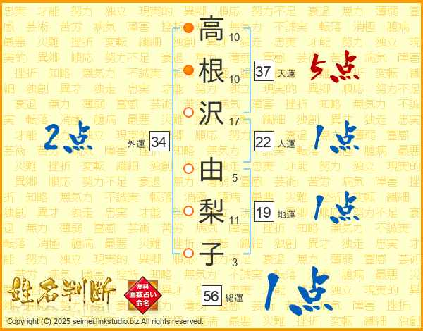 高(10画)根(10画)沢(17画) 由(5画)梨(11画)子(3画)