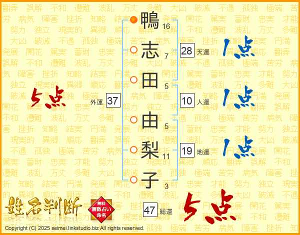 鴨(16画)志(7画)田(5画) 由(5画)梨(11画)子(3画)