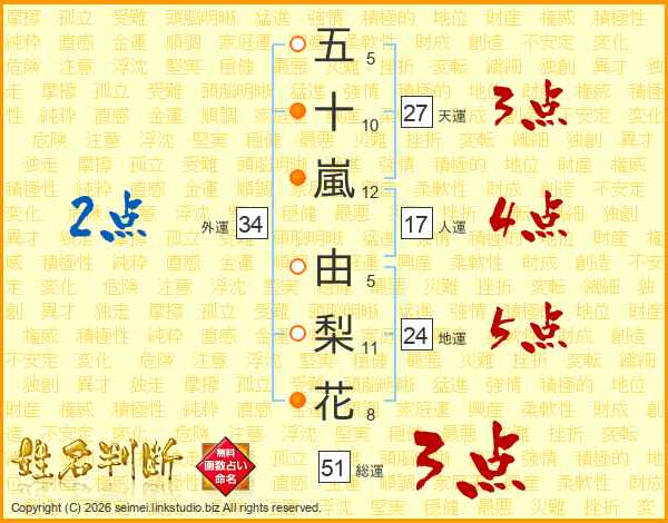 五十嵐由梨花さんの総運は51画の3点!