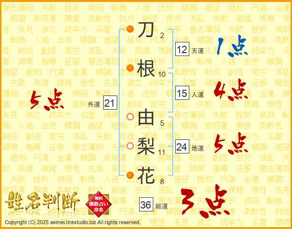 生活面を象徴する運勢です。外部から受ける影響力を表し、結婚運、家庭運や職場、環境への順応性を表します。総運から人運を引いた画数。姓や名が1文字の場合を除く。
