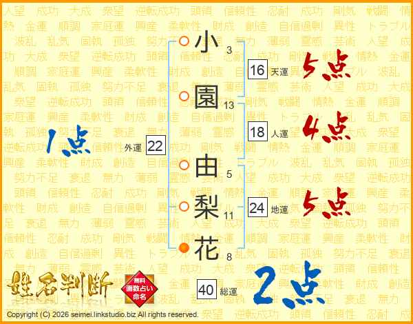 小園由梨花さんの総運は40画の2点!