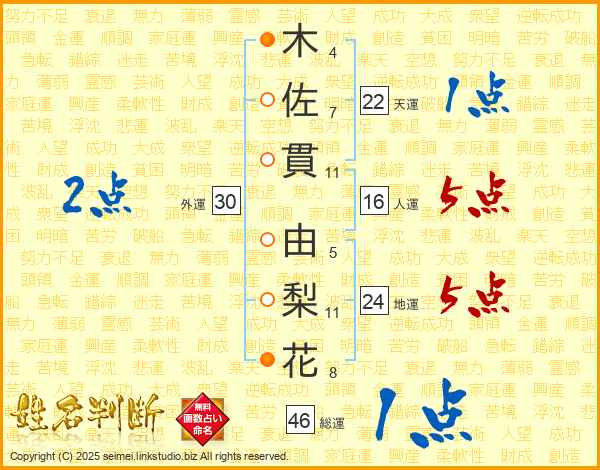 木(4画)佐(7画)貫(11画) 由(5画)梨(11画)花(8画)