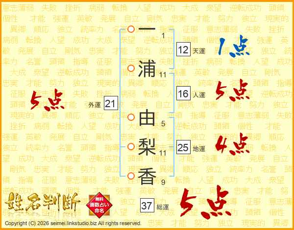 一(1画)浦(11画) 由(5画)梨(11画)香(9画)