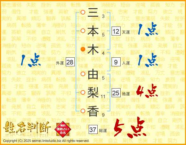 三(3画)本(5画)木(4画) 由(5画)梨(11画)香(9画)